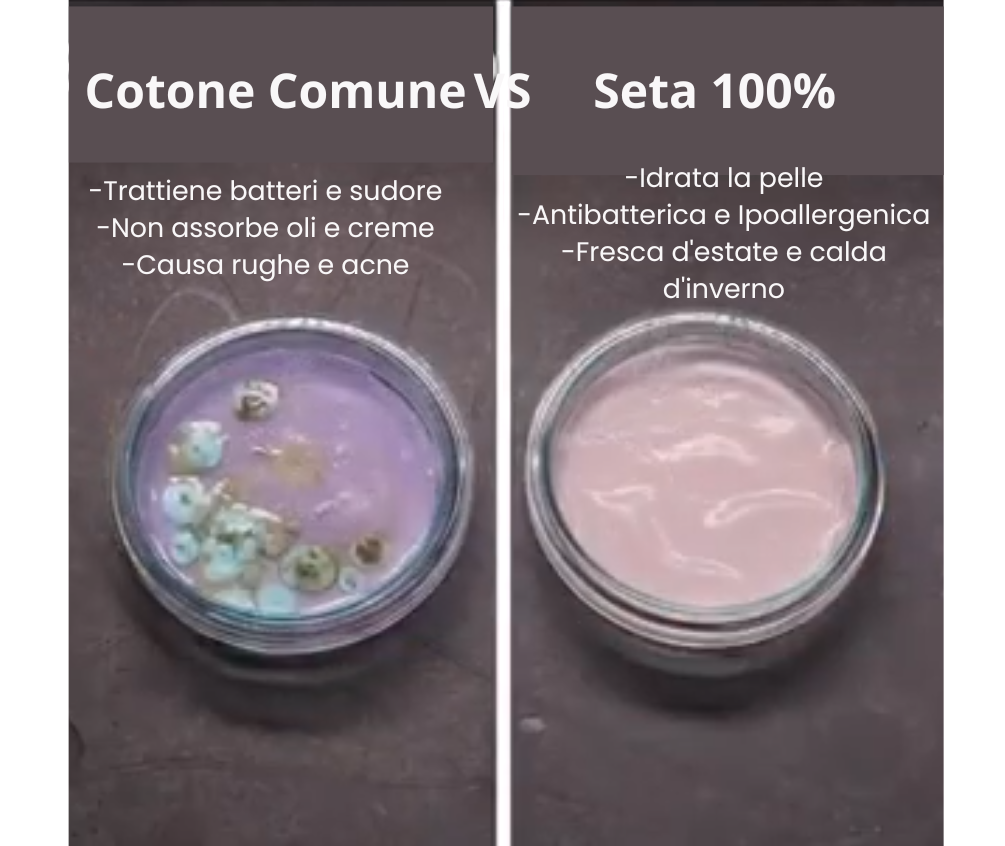 Durante il sonno, il viso resta premuto contro il tessuto per ore. Il cotone crea attrito e assorbe umidità, favorendo la comparsa di pelle segnata al risveglio e di una distribuzione irregolare della pressione sul viso, che può far apparire una parte più gonfia o diversa dall’altra.